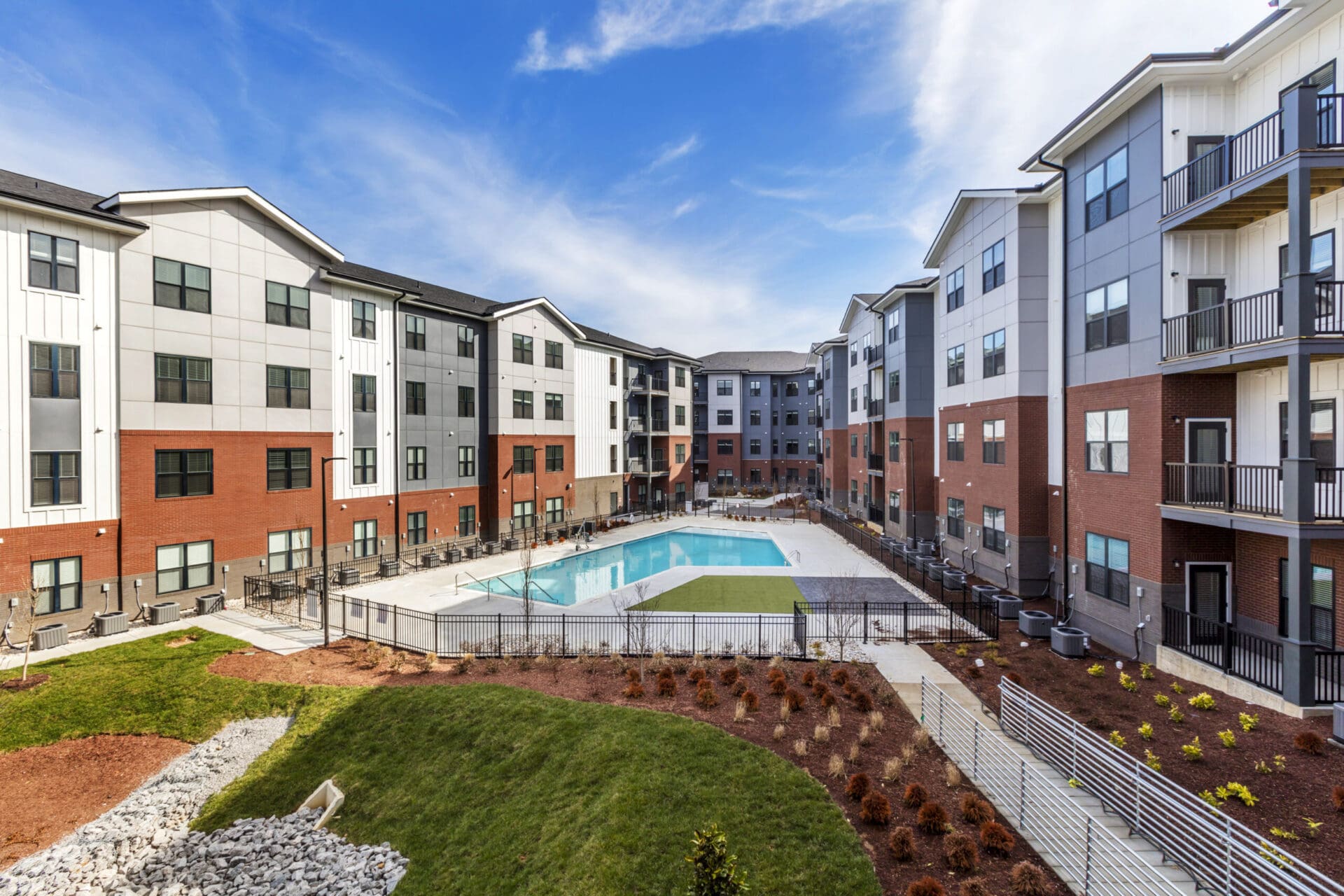 The Crockett Apartments is a 192,000-square-foot greenfield multifamily development consisting of two four-story residential buildings. Building One includes 71 apartment units, while Building Two adds 128 units, together providing modern accommodations across the 8.5-acre site. Constructed on shallow foundations, the wood-frame structures feature exterior façades of brick, stone, and siding. Site improvements include 259 parking spaces and a range of tenant amenities, highlighted by a 1,800-square-foot pool area with stamped concrete decking, artificial turf lounging, and a gated entrance. Three elevators provide vertical access within the buildings, enhancing accessibility and convenience for residents.
