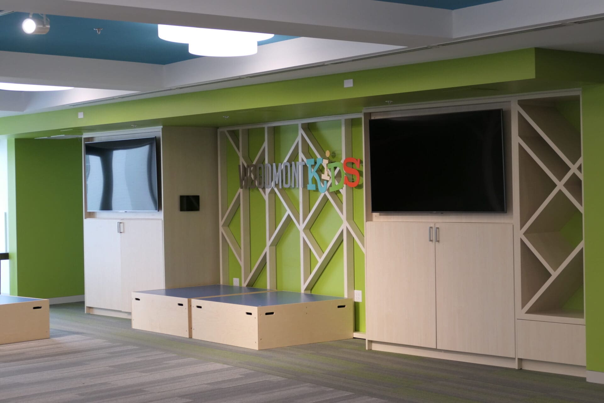The lower-level children’s center features classrooms and adaptable flex space for elementary-aged children, highlighted by a custom slide connecting it directly to the worship center level. The result is a dynamic and engaging environment that enhances both functionality and the overall worship experience.
